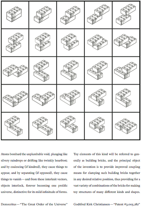 Do you think of LEGO when you think of poetry? Check out Christian Bök’s poem “The Great Order of the Universe” (shared through The Poetry Foundation). “‘The Great Order of the Universe’ is a response to the fiftieth anniversary of the LEGO patent. Using a conceptual strategy reminiscent of Sol LeWitt, the image enumerates every possible way of combining two LEGO bricks, each with eight pegs. The caption consists of two texts: the first, a translated paragraph from a volume by Democritus; the second, a transcribed paragraph from the patent by Godtfred Kirk Christiansen. The two paragraphs are perfect anagrams of each other.” (Source: Poetry (July/August 2009)).
