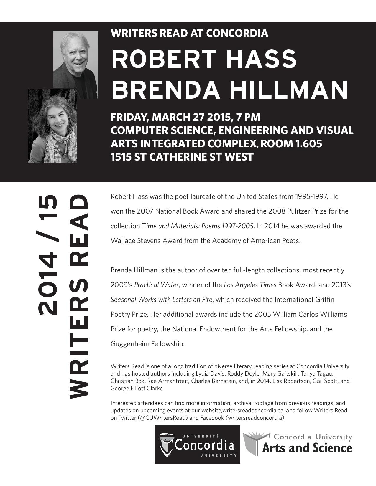 Writers Read is excited to welcome internationally acclaimed poets Brenda Hillman and Robert Hass on Friday, March 27 at 7 pm for a public reading in room EV 1.605 (1515 St. Catherine West). Brenda and Robert are also offering a master class that morning, at 11 am in room LB 646 (1400 de Maisonneuve). Spots are limited and a sign up sheet will be posted this Friday outside Professor Queyras’ door.