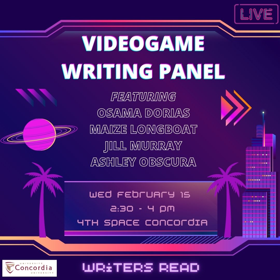 Curious about writing for video games? Writers Read has you covered. Get the perspective of four minds on working in the video game industry as writers, on entrepreneurship, on effective dialogue, on written versus visual storytelling, on building a ludic plot, and much more. Panelist include Osama Dorias, Ashley Obscura, Maize Longboat, and Jill Murray. The panel will be moderated by Paz O’Farrell.