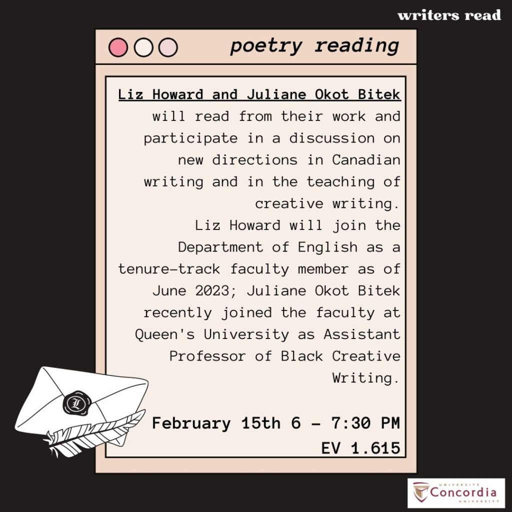 What better way to recover from Valentine’s Day than a poetry reading? Liz Howard and Juliane Okot Bitek will read from their work and participate in a discussion on new directions in Canadian writing and in the teaching of creative writing. Liz Howard will join the Department of English as a tenure-track faculty member as of June 2023; Juliane Okot Bitek recently joined the faculty at Queen’s University as Assistant Professor of Black Creative Writing.