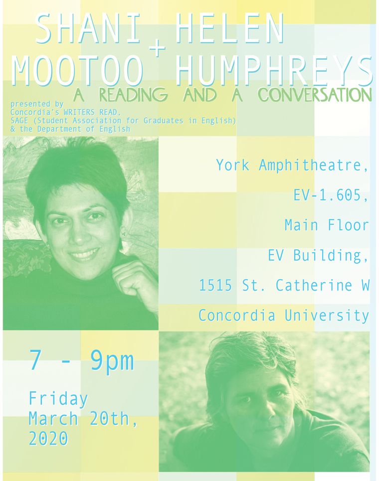 Cancelled — Concordia’s Writers Read, the Student Association for Graduates in English (SAGE) & the Department of English present Shani Mootoo & Helen Humphreys. Dear Friends, from Sina Queyras at Writers Read on Facebook: We have had to cancel our March 20 event with Helen Humphreys and Shani Mootoo, but we are sending love and … Continue reading Cancelled — Shani Mootoo & Helen Humphreys: A Reading & Conversation Cancelled