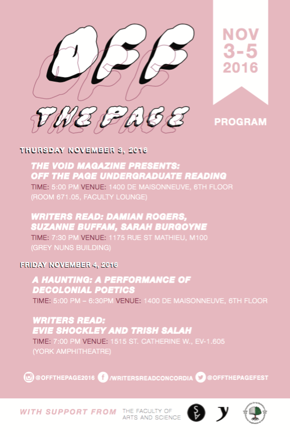 Off the Page event: November 4th, 7pm, York Amphitheatre, EV 1.605, 1515 Rue St. Catherine Those who know Evie Shockley from her 2006 publication, a half-red sea (Carolina Wren Press, 2006), will know how her lyrical style contains themes of ancestry and racial identity which flow through contexts of modern existential threats. Shockley’s words are … Continue reading In with the New Shockley